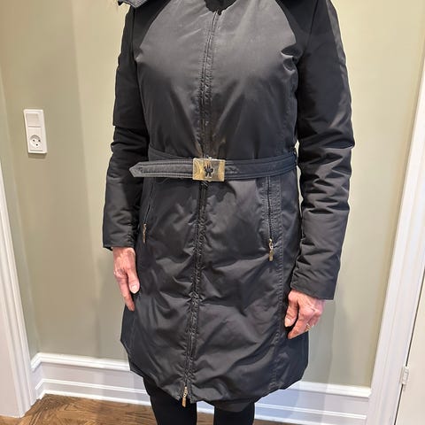 Moncler Vinterjakke i sort farve, størrelse M til kvinder. Jakken er designet til vinterbrug med en polstret konstruktion for ekstra varme. Den har en lynlåslukning foran og to lommer med knapdetaljer. Materialet er let og isolerende, egnet til koldt vejr.
