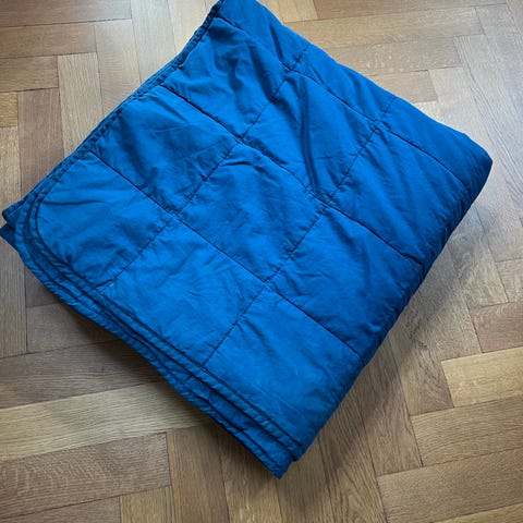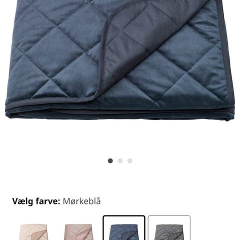 IKEA sengetæppe i mørkeblå farve med quiltet mønster. Fremstillet af tekstilmateriale og designet til at bruges som sengetæppe dobbeltseng.