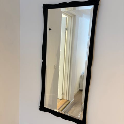 Spejl med sort ramme. Spejlet er designet til at hænge på væggen, hvilket gør det velegnet til soveværelser eller entréer. Materialet består af glas med en ramme i sort træ.