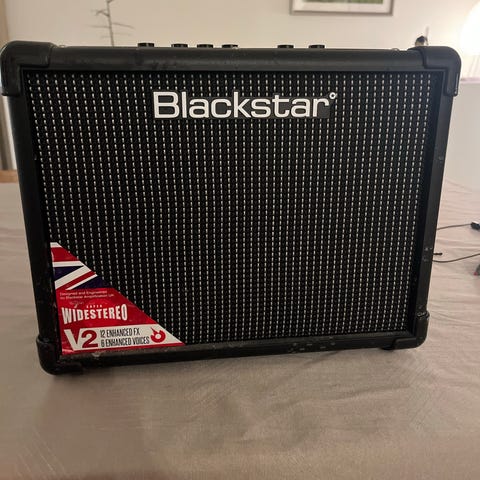 Blackstar ID:Core V2 Guitarforstærker med 20 watt effekt. Sort farve med kontrolpanel på toppen, der inkluderer forskellige justeringsmuligheder for lyd. Forstærkeren leveres med tilhørende strømforsyning og kabler. Velegnet til øvelse og mindre optrædener.
