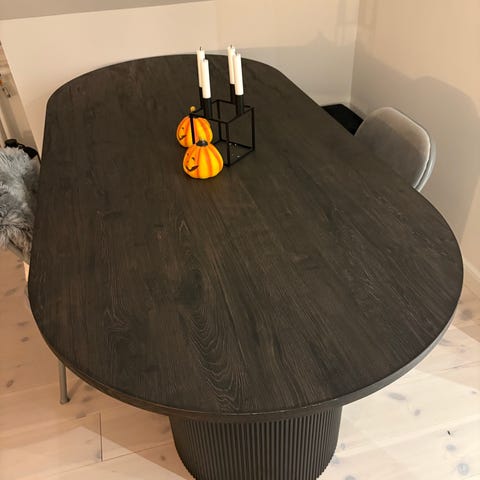 Peter Boy Design ovalt spisebord i sort laminat med stålben og flot kraftig afrundet bordplade. Dansk design, flot udførelse. Størrelse 100 x 220. Højde 72 cm. Sælges uden stole. Kan afhentes i Helsingør. Bordben kan skiftes.