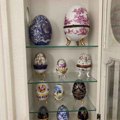 keramisk påskeæg med dekorativt mønster i blå og grønne nuancer. Ægget er håndmalet med detaljerede blade og striber. Signeret af kunstneren på undersiden. Velegnet som dekorativ genstand til påske eller som samlerobjekt.. pris 1 æg500 kr 3 st 1200kr