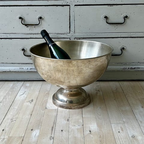 Fransk champagnebowle /champagnekøler. Super cool og dekorativ fransk champagne køler / champagne bowle i stål fra champagneproducenten Perrier-Jouët med navnetræk på to sider. En stor og rummelig køler med god plads til 2 champagneflasker.
