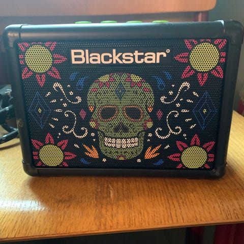 Blackstar ID:Core V2 Guitarforstærker med flere kontrolknapper til lydindstillinger. Forstærkeren er sort, bærbar og leveres med tilhørende strømadapter og kabler. Velegnet til elektrisk guitarbrug.