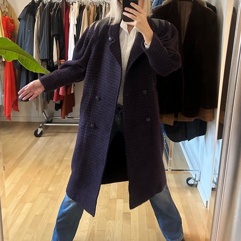 Fin vintage vinterfrakke. Sort meleret. Skulderpuder og skind detaljer på skulderen. Uld blend. Fra 1980’erne.