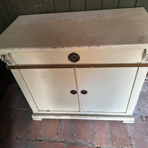 Gammel skænk. Malet hvid og sat pynte lås i, der følger nøgle med. Trænger til at blive malet igen men ellers står den fin. Solid.