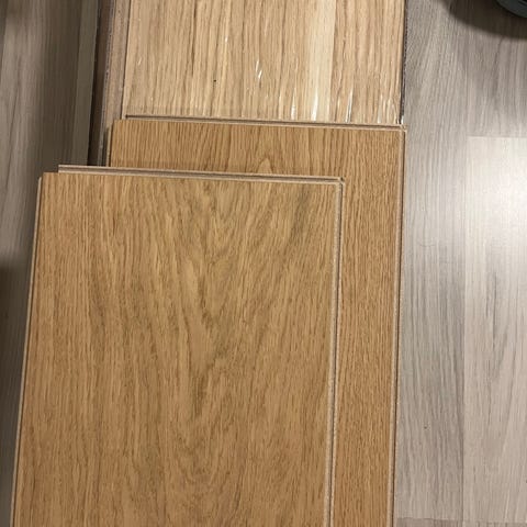 Heraf eet brædt, i perfekt stand. Hvor der er skåret 4cm af. (de 4cm vi manglede i, at lægge vores gulv)