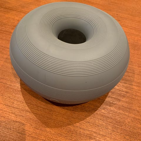 Lille donut i blå/grå. Har syn af brug og trænger til lidt luft.