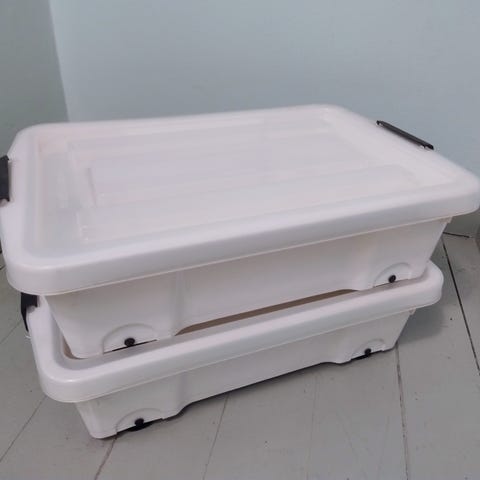1 stk. m/ 2 hjul og 2 filt puder, låg repareret med gaffa (se foto)