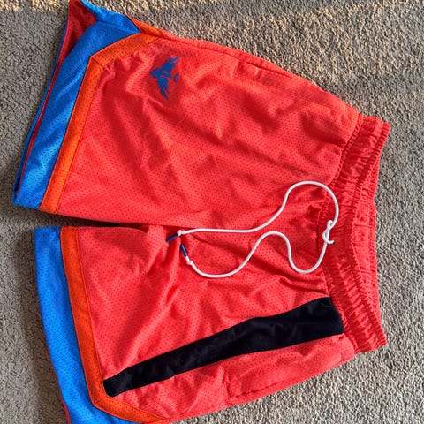 Jordan Basketball Shorts i størrelse S til mænd. Shortsene har en rød og hvid farvekombination og er designet til basketballbrug. Materialet er let og egnet til sport.