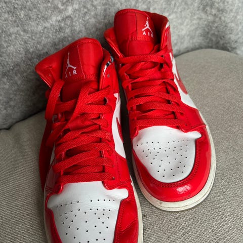 Air Jordan Sneakers i størrelse 41 med farverne rød og sort. Skoene har ekstra snørebånd i sorte og er designet som høje sneakers med detaljer i rød og sort materiale.