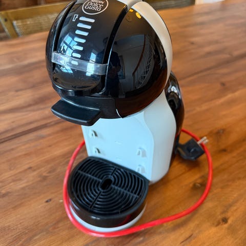 NESCAFÉ Dolce Gusto kaffemaskine i sort farve. Maskinen har et kompakt design med et aftageligt vandreservoir bagtil. Den er udstyret med et betjeningspanel på toppen til valg af kaffestyrke og kopstørrelse. Maskinen tilsluttes med ledning og egner sig til brygning af forskellige kaffetyper ved brug af kapsler.