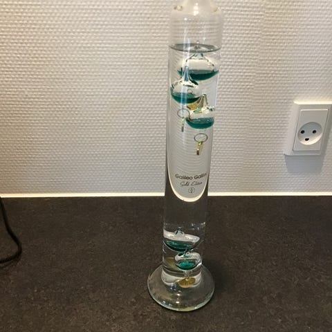 GALILEI termometer med 10 glaskugler fyldt med væske for synlighed og små messingskilte, der angiver temperaturen.
