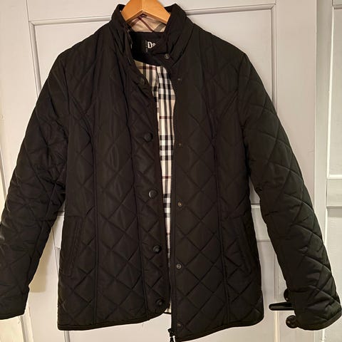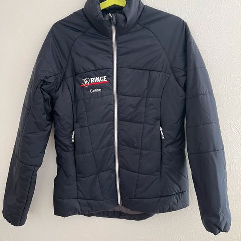 JOTT udendørstøj i størrelse L til kvinder. Jakken er blå og har en quiltet, letvægtsdesign med hætte. Den er velegnet til udendørs brug og har detaljer som lynlås og indvendige instruktioner til brug.