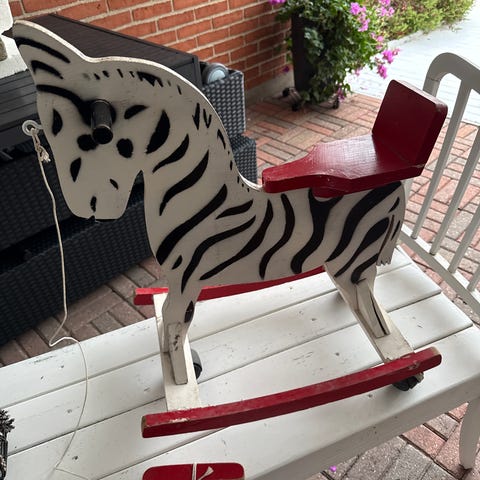 Gammel gyngehest med patina. Trænger måske til at slibning i nogle kanter.