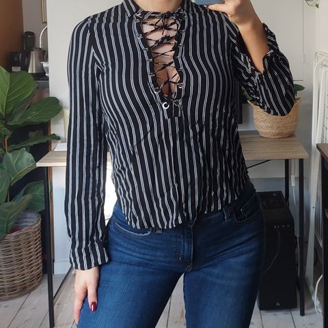 Sort og hvid stribet bluse med snørre detalje foran brystet 29kr