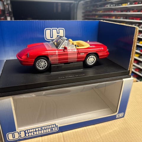 Revell Alfa Romeo Spider modelbil i skala 1:18. Modellen er rød med gule hjul og detaljer i metall. Die-cast materiale med åpningsbare deler. Egnet som samleobjekt eller dekorasjon.