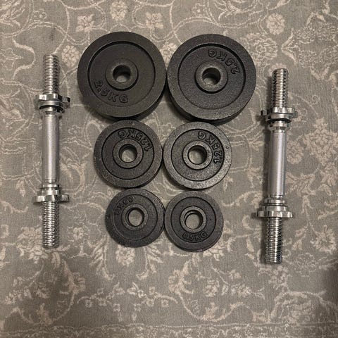 Sæt bestående af vægtstænger og vægtskiver i sort og rød farve. Vægtskiverne har forskellige vægtangivelser, herunder 1,25 kg, 1,8 kg og 2,0 kg. Materialet er robust plast eller gummi. Sættet inkluderer også låse til vægtskiverne. Velegnet til styrketræning og fitness.