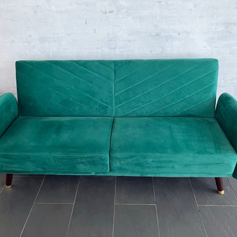 Sovesofa 3-personers SAARILA med velourbetræk i orange farve. Sofaen har en bredde på ca. 180 cm og en dybde på ca. 85 cm. Benene er fremstillet af træ. Velegnet til både sidde- og soveformål.