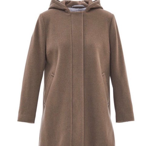 Camel farvet uld frakke fra Comptoir des cotonniers med bælte. Frakken er meget oversize i str. og er nærmere en str. M end str. XS. Designet som en klassisk frakke med bælte til at justere pasformen. Materialet er 95% uld og 5% cashmere.