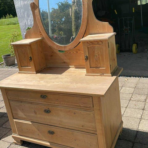 Smukt gammelt chatol med vippe spejl, 3 store og 6 små skuffer.