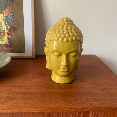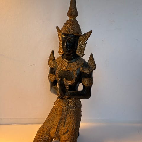 Statuen forestiller en Buddha med detaljeret ansigt og klæder. Sidder med en lampe, der symboliserer visdom og dens lys siges at kunne sprede uvidenhedens mørke. Materialet er metal.,Afhentes i:,Røde Kors Sorø (335),Bemærk at mail, chat og beskeder ikke besvares, og varen skal købes på knappen "Gå til varen"