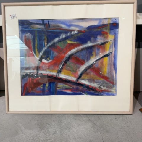 Billedet forestiller et maleri med en blå farvetone, der viser et vindue med åbne skodder og blomster. Der er en stige og en kat, der ligger på jorden. Maleriet er indrammet.,Afhentes i:,Røde Kors Kolding (621),Bemærk at mail, chat og beskeder ikke besvares, og varen skal købes på knappen "Gå til varen"