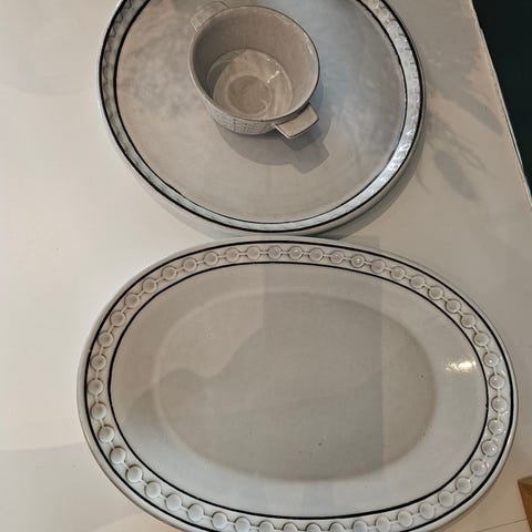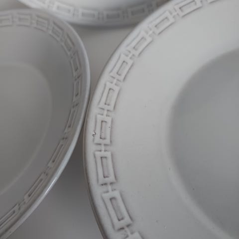 Tallerkenerne har en glat overflade og en subtil prægning langs kanten.,Afhentes i:,Røde Kors Holstebro (661),Bemærk at mail, chat og beskeder ikke besvares, og varen skal købes på knappen "Gå til varen"