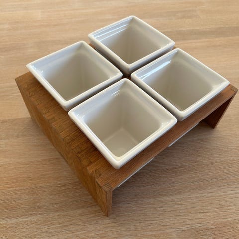 Skålene har en firkantet form og er designet til køkkenbrug. Materialet er keramik, og farven er hvid. Sættet kan anvendes til servering eller opbevaring af madvarer.