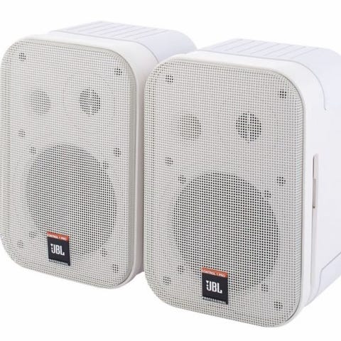 JBL Control One højttalere i sølvfarve. Kompakt design med metalgitter foran og bagtil tilslutningsterminaler. Velegnet til indendørs brug og kan monteres på væg med medfølgende beslag og sikkerhedskabel. Materiale: plast og metal.