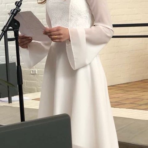 Festkjole, 115287, str. L, STR 42/44 kort lilly konfirmations kjole str 42/44, flot kort hvid lilly kjole størelse 42/44 den er brugt den ene bindebånd er gået løs og der er sløjfebånd med dertil og halvhansker se billeder se billeder og forstør