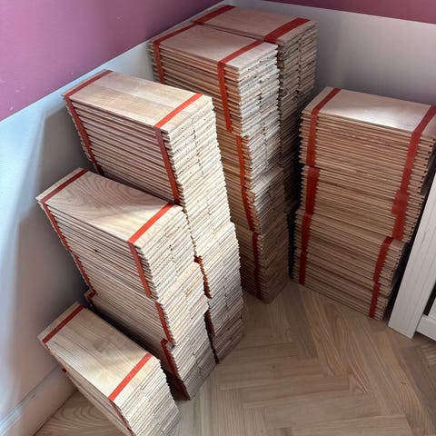 Ca dimensioner på 16 mm tykkelse, 70 mm bredde og 390 mm længde. Stavene er fremstillet af ubehandlet eg og velegnede til gulvbelægning.