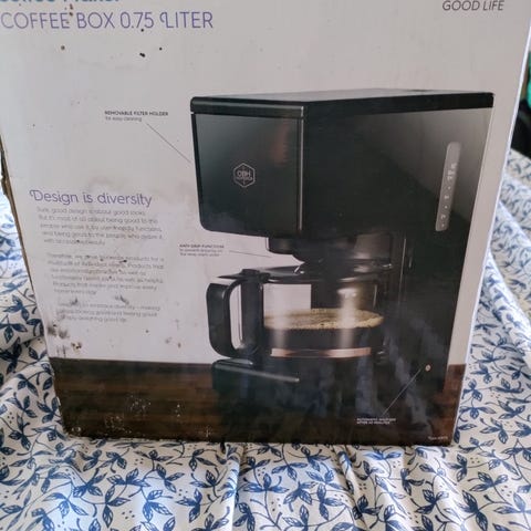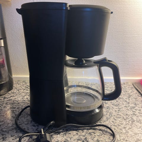 Point Coffee Maker with Anti Drip Valve. This coffee maker features an anti drip valve to prevent spills. The design includes a transparent water reservoir and a glass carafe. Suitable for brewing coffee with ease and convenience.