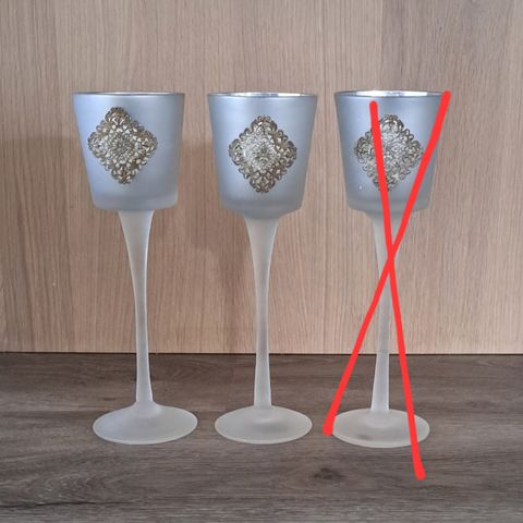 Sælges 4 stk . 2 stk Små +2 stk større, flotte fyrfads glas med sølv kant og slebet bladmotiv.