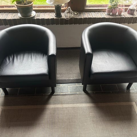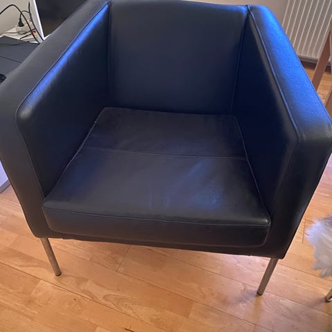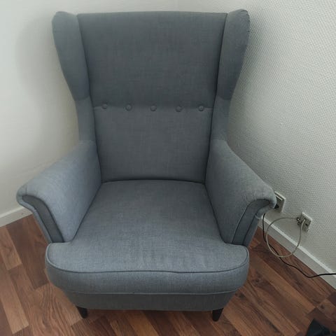 Gør middagen ekstra hyggelig med en polstret stol og mørke træben fra IKEA. Stolen har en knapdetaljeret ryg og armlæn, hvilket giver støtte og komfort. Velegnet til brug i spisestue eller som ekstra siddeplads i stuen. Ny pris: 1600 kr.