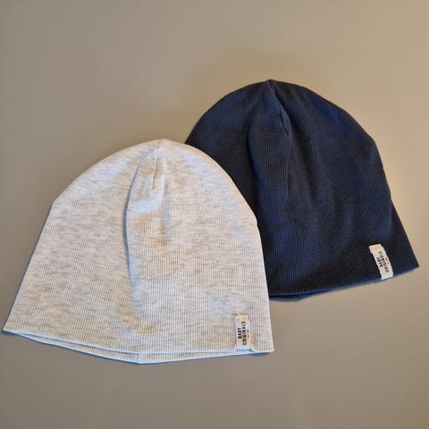 H&M børne huer i størrelse 110-128, 134-170 til drenge. Den ene hue er multifarvet med dinosaurprint på mørk baggrund, og den anden er grå med sort dinosaurprint. Materialet er blødt og velegnet til børn.