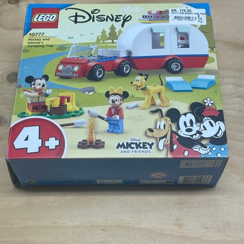 LEGO Disney Mickey Mouse Campingvogn legetøj med tilbehør inklusive Mickey Mouse figur, Pluto figur, campingvogn og bil. Sættet indeholder to byggevejledninger og er designet til leg og samling.