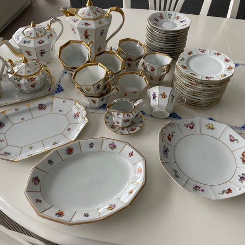 Flot kaffestel i en smuk farve med svane og blomster.
