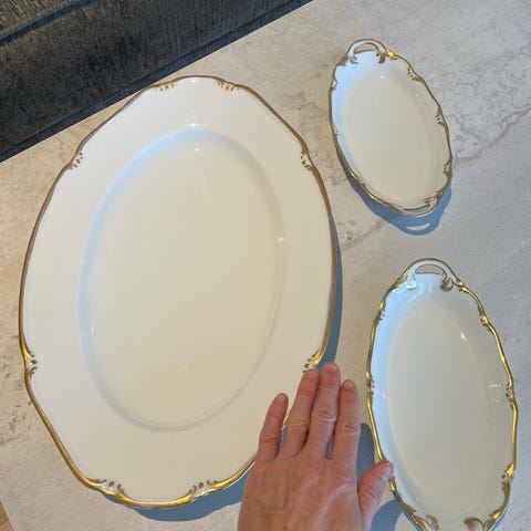 Fadet er bladformet med hank og meget fine sølvkanter. Er formentlig fra 50'erne, måske 40'erne. I bunden af fadet står nr. 40 og nr. 138, initialerne P.U.