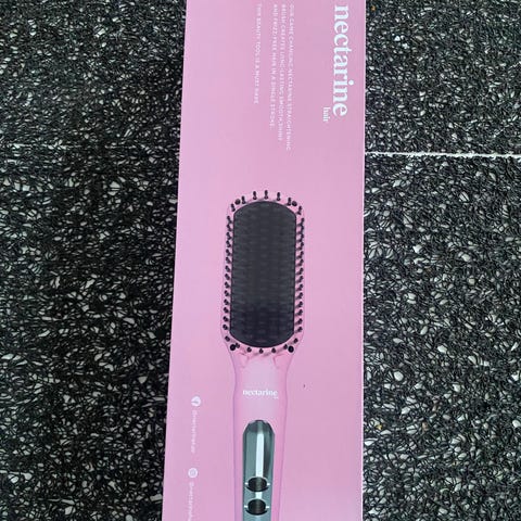Nectarine Hair Glattebørste i pink farve. Elektrisk hårbørste med varmefunktion, designet til at glatte håret. Indeholder en tænd/sluk-knap og temperaturindstillinger. Kommer med ledning og opbevaringsæske i matchende pink.