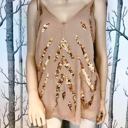 By Malene Birger Top i størrelse M, farven guld/bronze.. Toppen har en glitrende effekt og er designet til kvinder. Med en skulderstrop. Str 38