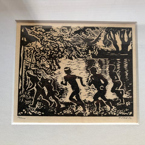Særker Sørensen. Urtidsjagt. Farvetræsnit. 51 x 59 cm. Signeret samt nummereret 70/120. (På min side findes et lignende farvetræsnit af Særkersørensen. Begge kan erhverves til en samlet pris på 600 kr.)