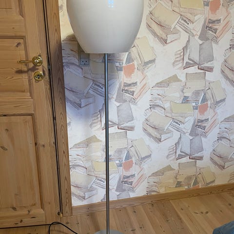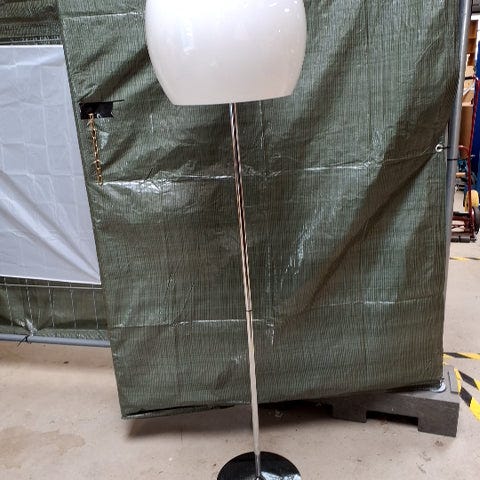 Lampen er med stor rund hvid mundblæst matteret glas skærm og stel i blank stål.