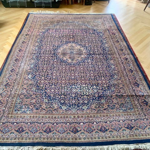 Ægte Persisk håndknyttet Bidjar tæppe, 92 × 165 cm, uld på bomuld, nyrenset og I god tilstand uden falme. Tykt, robust tæppe med klassik Bidjar medallion mønster I flotte rød, blå, grøn og beige higlights.