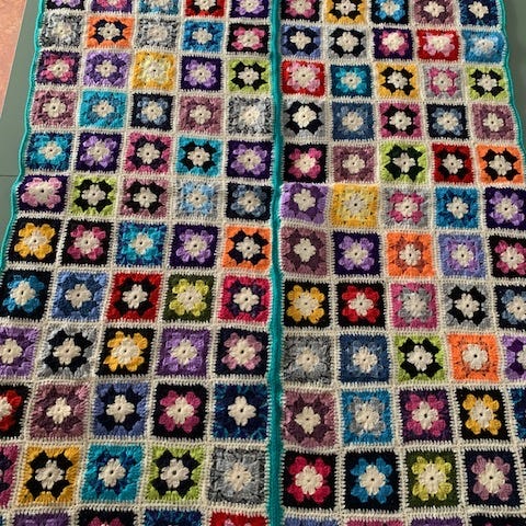 Retro hjemmelavet mormortæppe, hæklet i flere farver men med rød som kantfarve på alle firkanter.