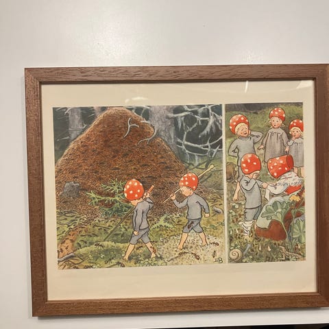 Print fra gammel Elsa Beskow bog “De små Skovnisser”. Prisen er for et billede, vælg mellem mørk egetræ eller sort træramme.