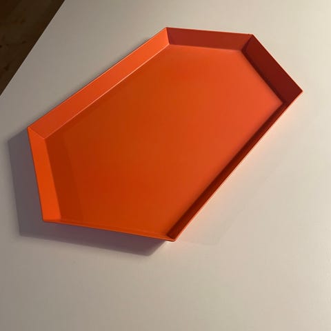 Dette er en HAY Kaleido bakke i pulverlakeret stål, designet af Clara von Zweigbergk. Bakken er i orange farve og har en sekskantet form. Velegnet til servering eller som dekorativt element i hjemmet.