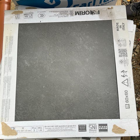10 hele pakker. I alt 30 fliser, svarende til 10,8 m2. Nypris hos Flisedesign i Søborg 5.600 kr. Overskud fra nybyg. De er 60x60 og 9,5 mm tykke. Producenten hedder Unicomstarker.