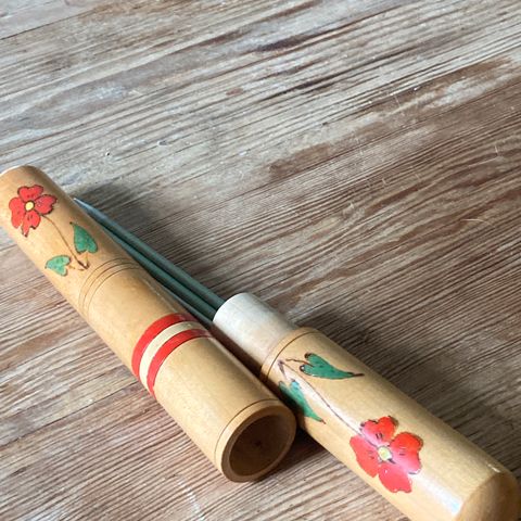 Fint gammeldags beholder til strikkepinde fra Oslo, 1948. Den er fremstillet af træ og måler 40 cm i længden og 3 cm i diameter. Etuiet er med lidt brugsspor.