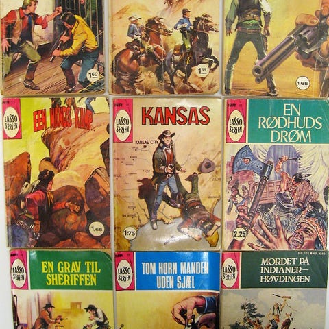 Lasso Serien, Kalar m. fl., Tegneserie, Gunfight serien, Ringo serien og Bajonet serien. Alle hæfter er 17,5 x 12,5cm. I alt 13 tegneseriehæfter.